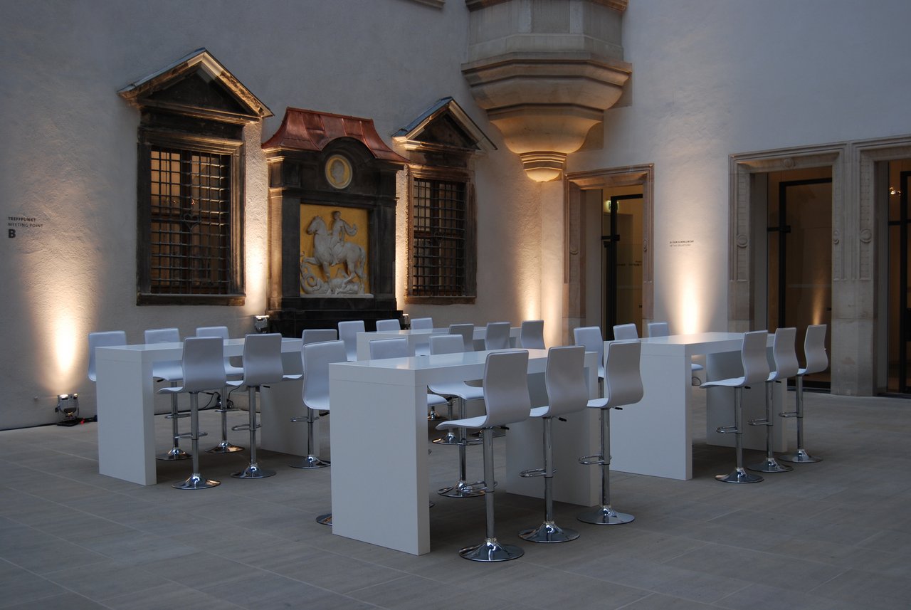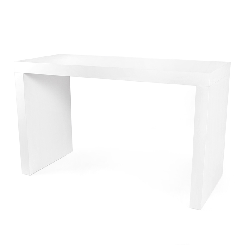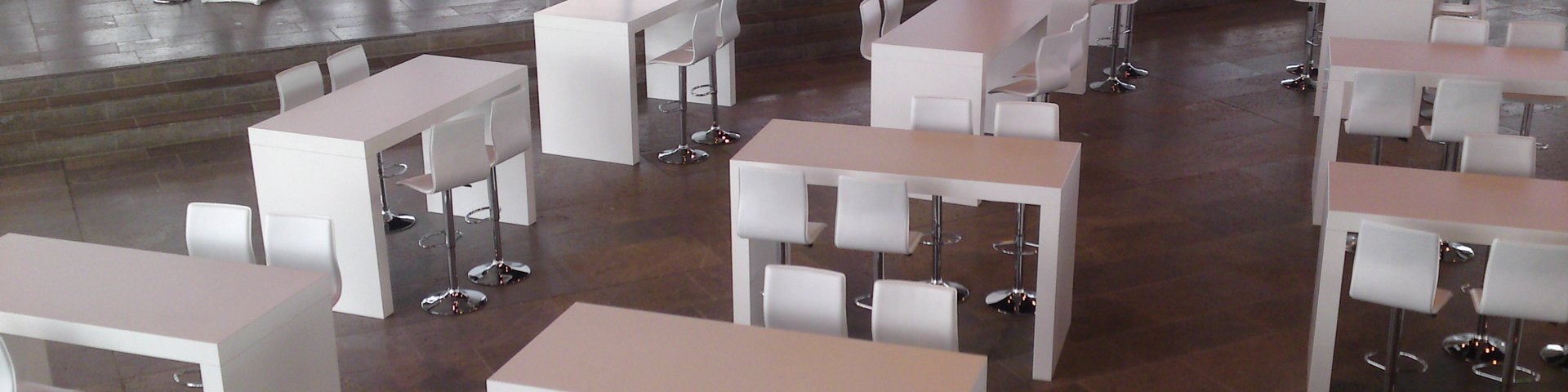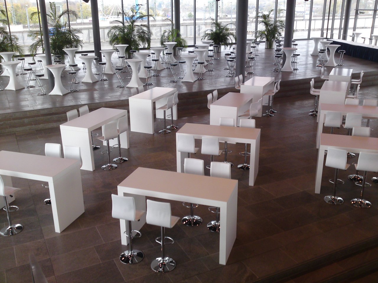Diese Stehtischbrücke präsentiert sich edel, modern und mit klaren Linien. Die Stehtischbrücke ist komplett weiß. Die relativ junge Tischform ist sehr beliebt bei Empfängen, Aftershow-Veranstaltungen oder bei Meetings.