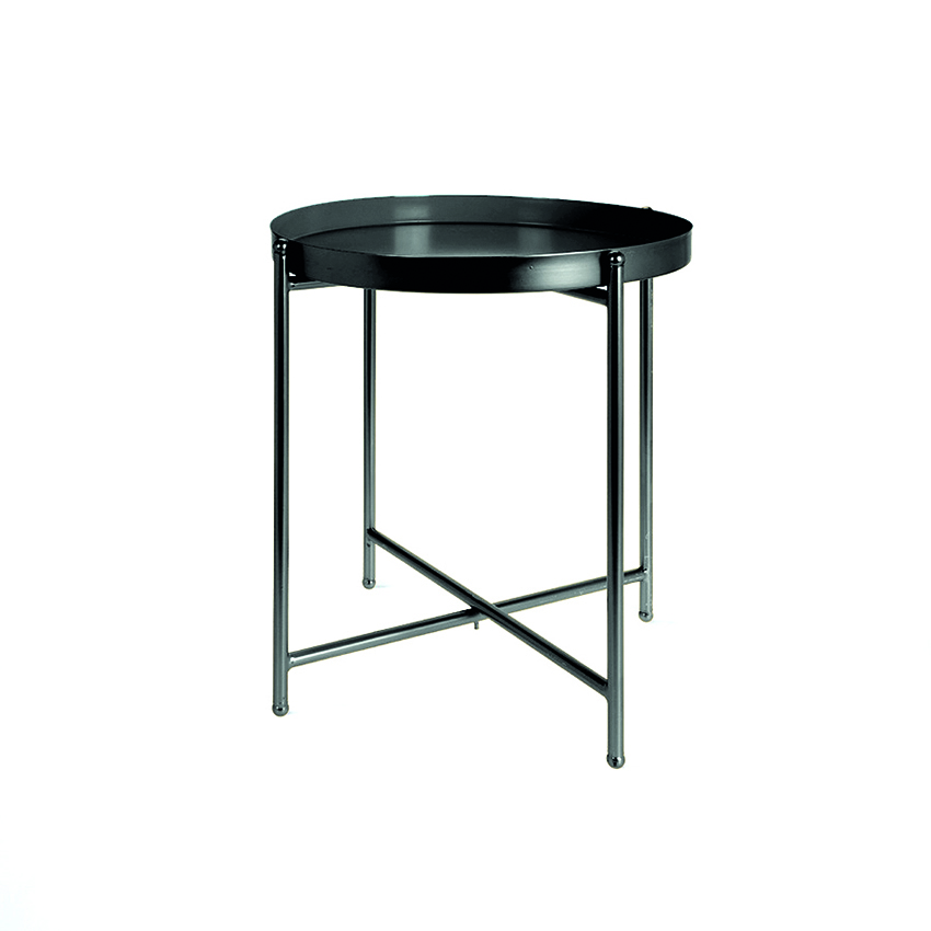 Der Metall Tisch hat ein schwarzes Gestell und eine schwarze Ablagefläche, die dem Tisch das gewisse Etwas verleiht.