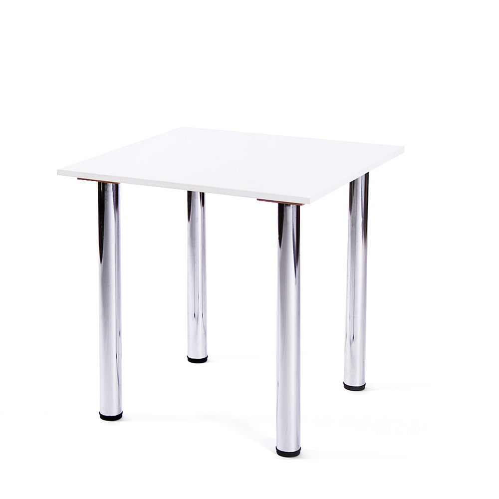Dieser einfache quadratische Tisch hat eine weiße beschichtete Tischplatte. Seine höhenverstellbaren Standfüße sind aus gebürstetem Edelstahl. Er ist vielseitig einsetzbar, eignet sich aber hervorragend als Tafel- oder Konferenztisch.