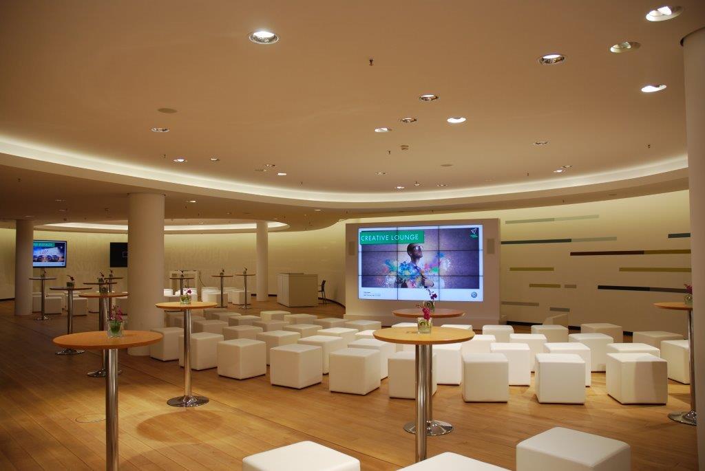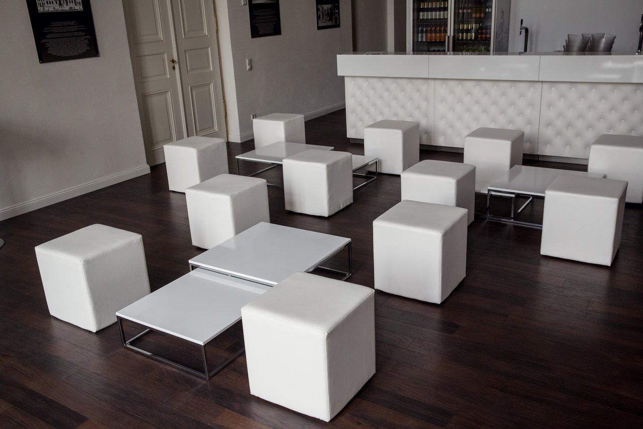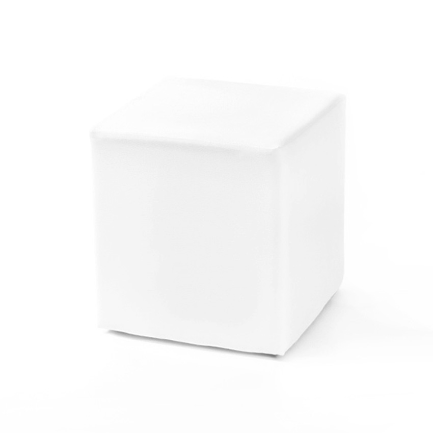 Dieser Hocker besteht aus Holz und hat einen gepolsterten Überzug aus weißem Textilleder. Er hat eine wunderschöne Optik und ergänzt unsere Lounge-Möbel perfekt. Ob Indoor oder Outdoor, er ist für jede Art einer Veranstaltung geeignet.