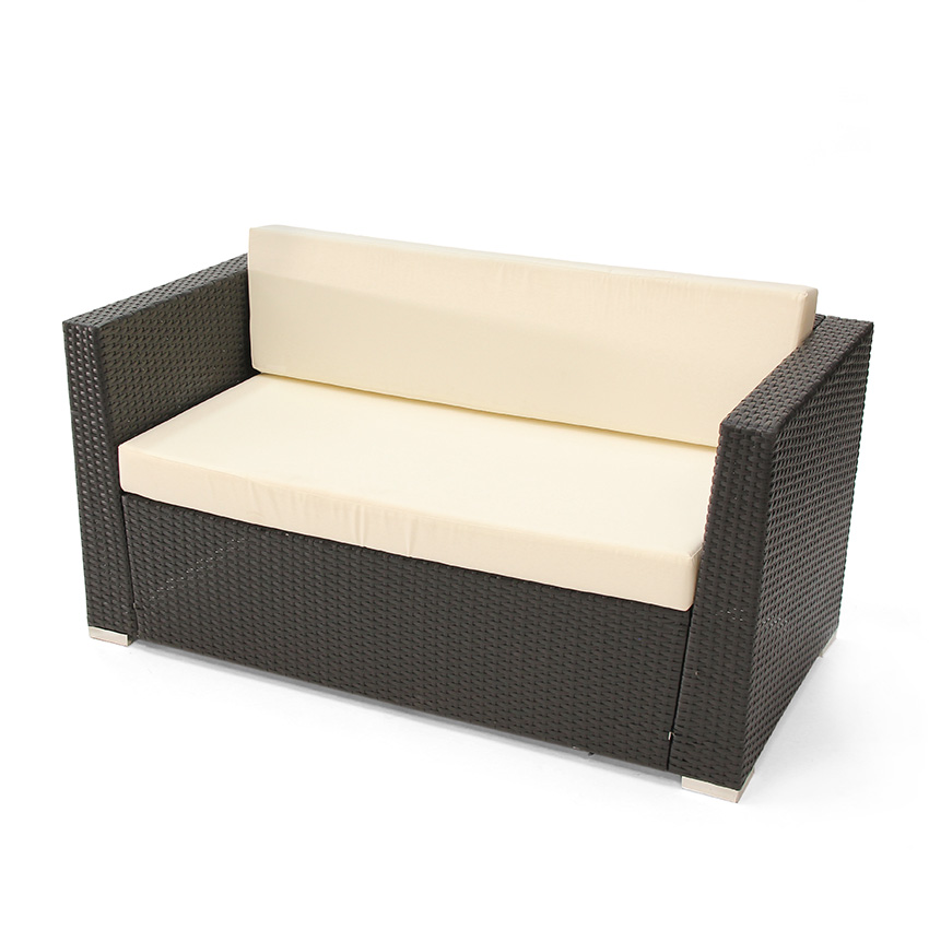 Die Outdoor-Lounge steht - der Sommer kann kommen. Dieser 2 Sitzer in mediteranem Flair hat ein anthrazitfarbenes Kunststoffgeflecht in Rattanoptik und ist wetterfest. Die Sitzkissen und Rückenpolster sind inklusive. Ideal ist der Zweisitzer für ein Sommerfest, eine Terrassenparty oder ein Gartenfest.