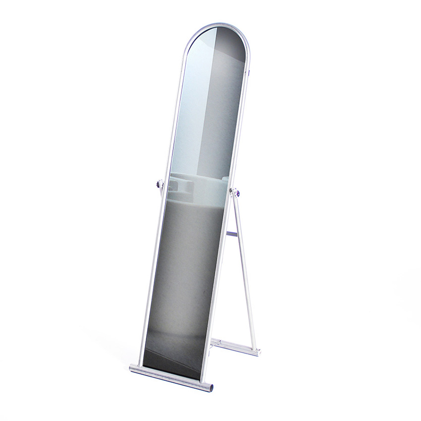 Dieser klappbare Standspiegel hat einen beschichteten Rundrohrrahmen aus Metall in Aluminiumoptik. Er eignet sich für eine Garderobe als Schminkspiegel oder einfach nur als Dekorationselement für Ihre Veranstaltung.