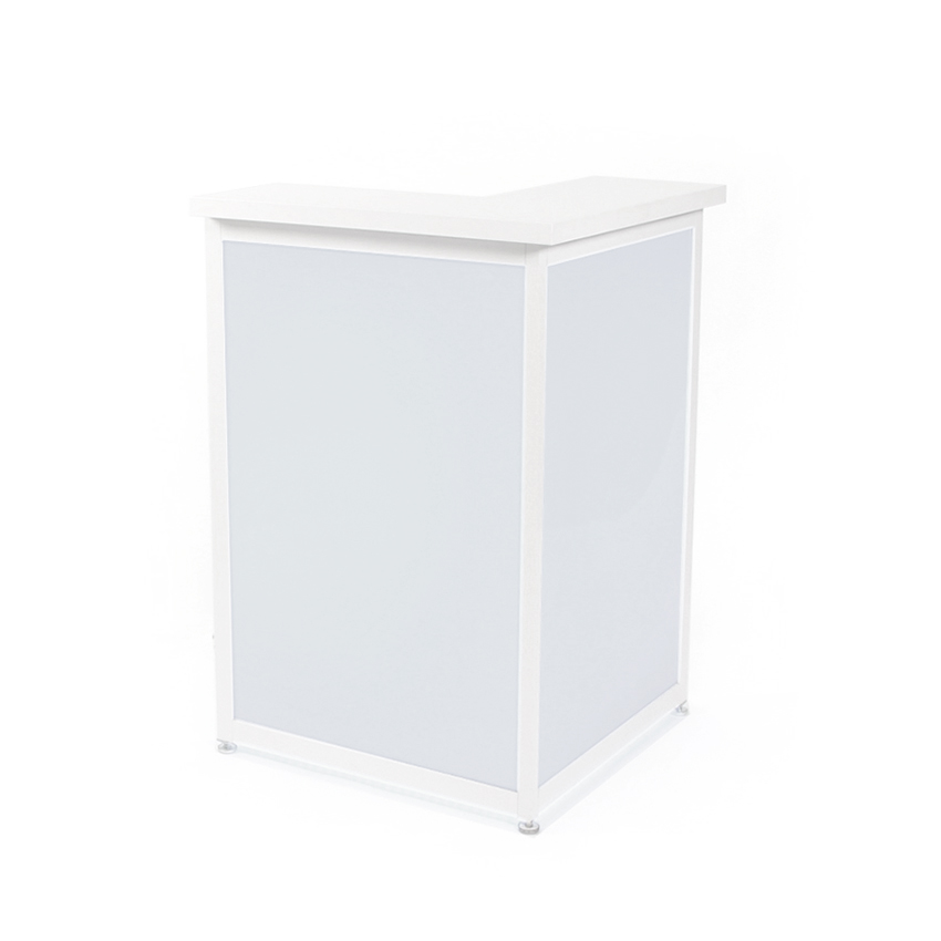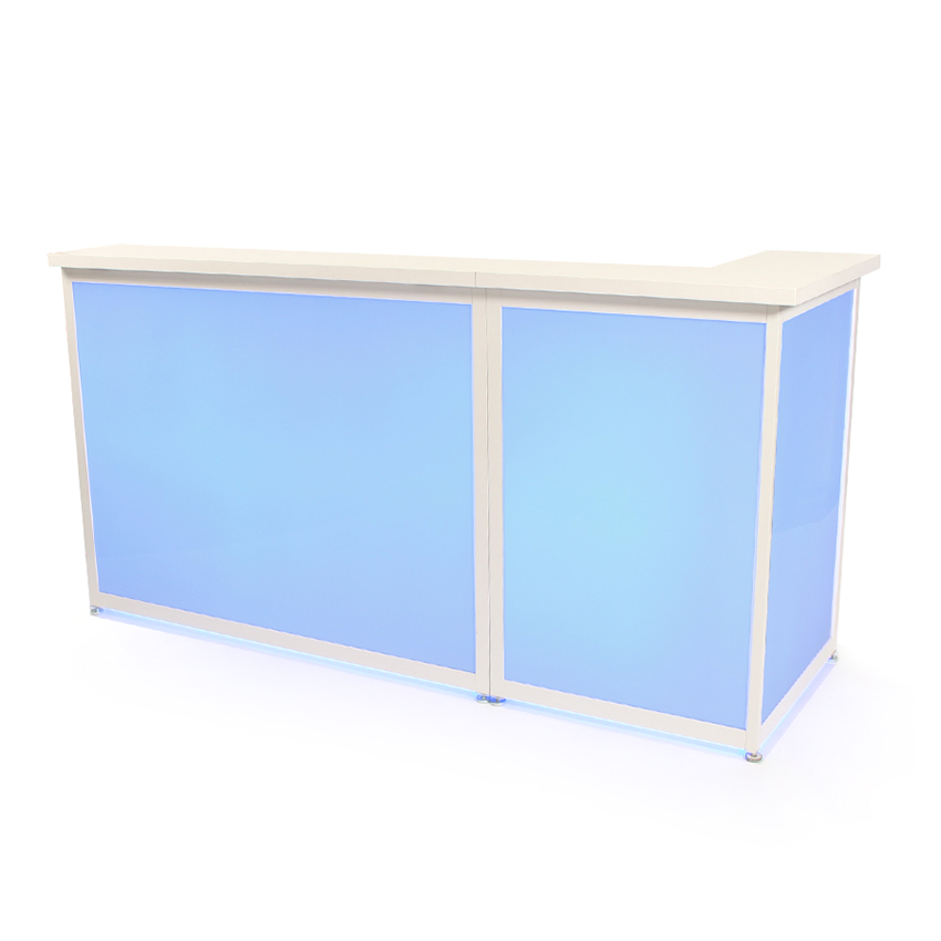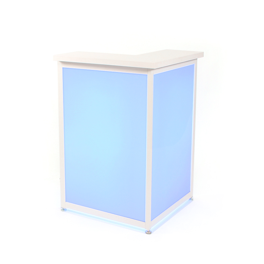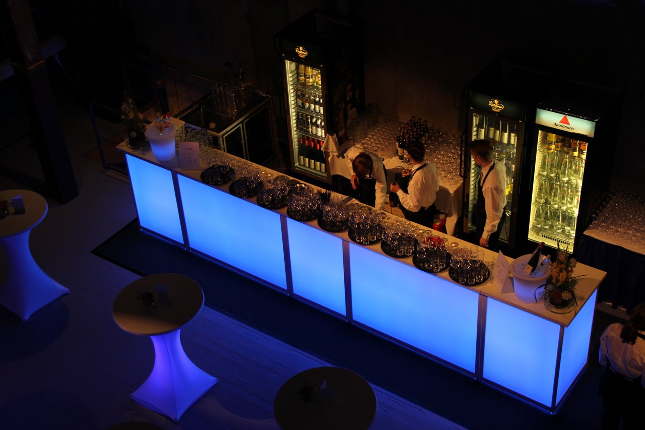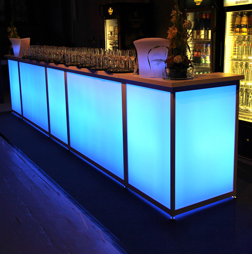 Diese Eck-Theke kann sowohl einzeln als Tresen oder als Bar genutzt werden. Auch kann die Theke als Eckteil für einen Empfang eingesetzt werden. Die Farben der Beleuchtung sind individuell einstellbar, sodass sie sich an jede Räumlichkeit oder Umgebung anpasst. Die Theke ist vielseitig einsetzbar und Ideal für ihre Party oder für eine Abendveranstaltung.