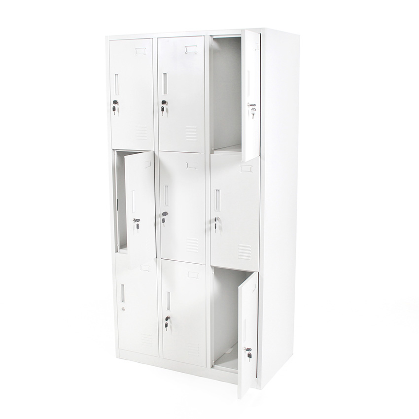 Dieser Wertfachschrank ist aus pulverbeschichtetem Stahlblech gefertigt und hat die Farbe Lichtgrau. Er ist korrosionsbeständig und sehr kratzfest. Er glänzt also durch eine ausgewöhnliche Lebensdauer. Viele kleine Details ergänzen das Rundum-Sorglos-Paket, wie zum Beispiel die Belüftungslöcher sowie die Etikettenhalter. Ausgestattet ist dieser Schrank mit 9 Schließfächern sowie Schlüssel für jedes einzelne Wertfach. Für höchstmögliche Sicherheit sorgen die Drehriegelschlösser sowie die einschlagenden Türen und lassen Langfingern kaum eine Chance.