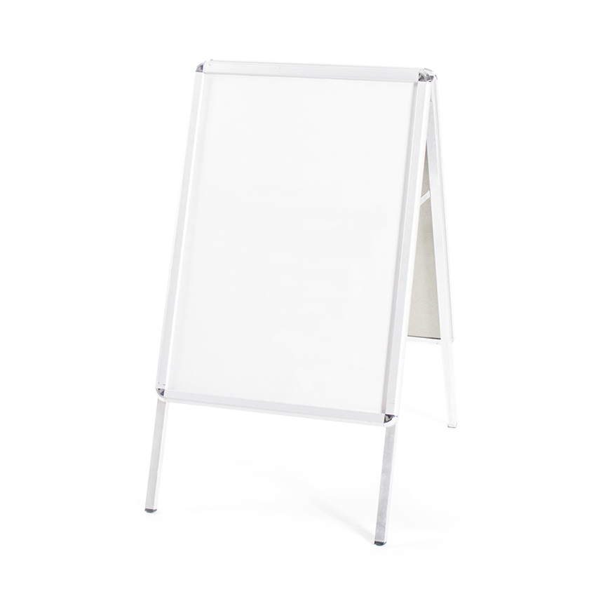 Dieser doppelseitige Kundenstopper hat einen hochwertigen silberfarbenen Aluminium-Klapprahmen mit einem 32 mm breiten Rahmenprofil. Der Plakatständer ist wetterbeständig und hat integrierte Wasserablauflöcher sowie eine UV-stabilisierende Posterschutzfolie. Die Standprofile sorgen für eine hohe Standfestigkeit. Er eignet sich als doppelseitige Hinweistafel für jegliche Art einer Veranstaltung.