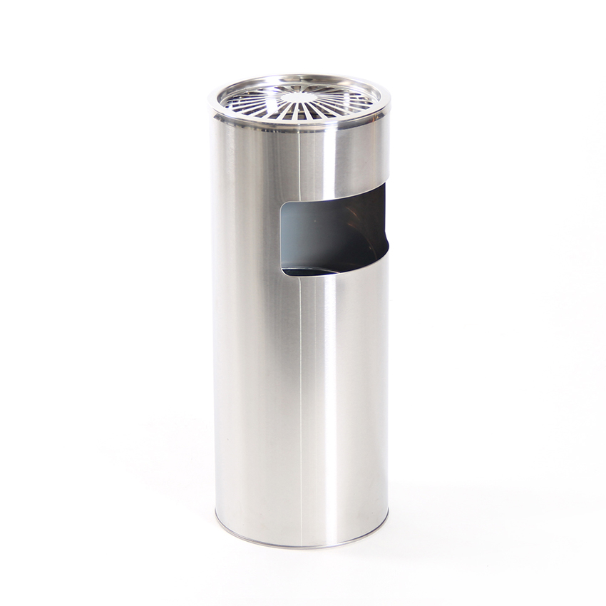 Dieser Standaschenbecher mit integriertem Papierkorb besteht aus verchromten Stahlblech und ist universell einsetzbar. Der Mülleimer besitzt einen herausnehmbaren Inneneimer aus Eisenblech. Am oberen Ende verfügt er über einen Aschenbecher aus Metall mit abnehmbarem Gitter und herausnehmbarem Behälter. Durch den Behälter ist die Asche leicht zu entsorgen. Schlicht, elegant und praktisch eignet er sich sowohl für den Innen- und Außenbereich.